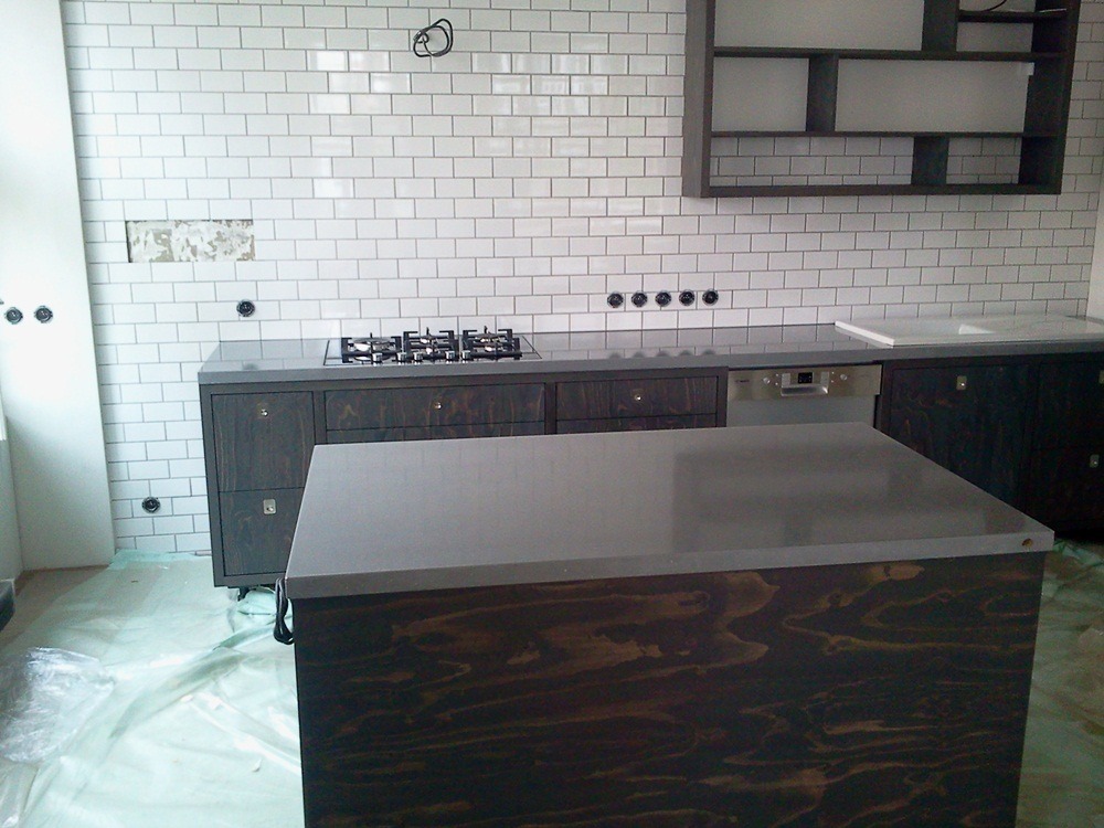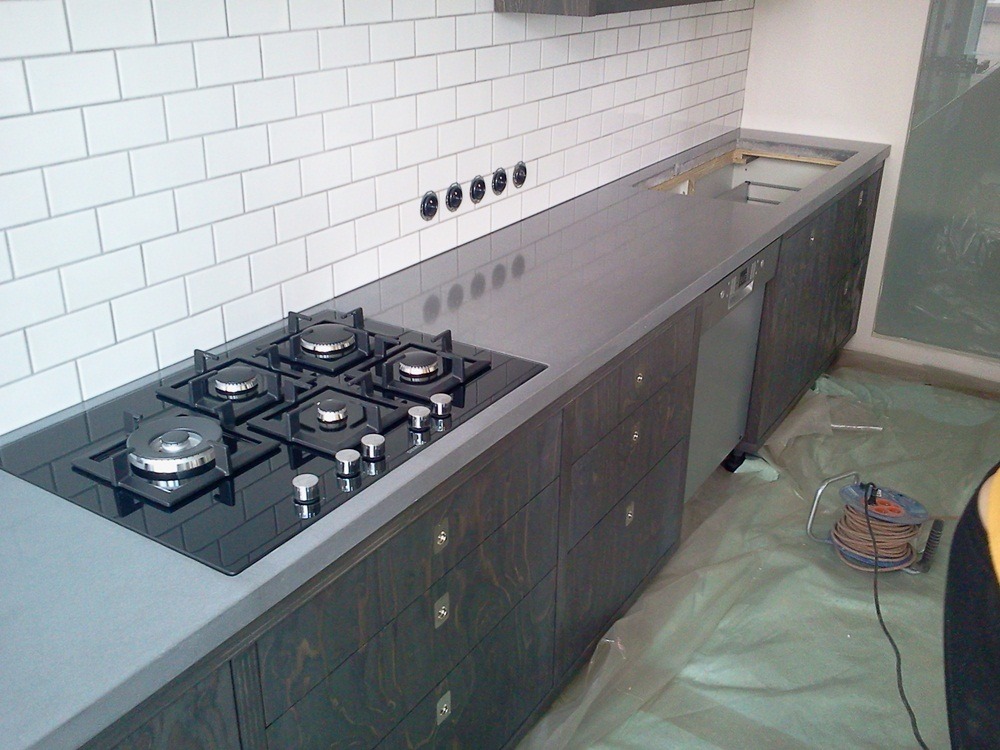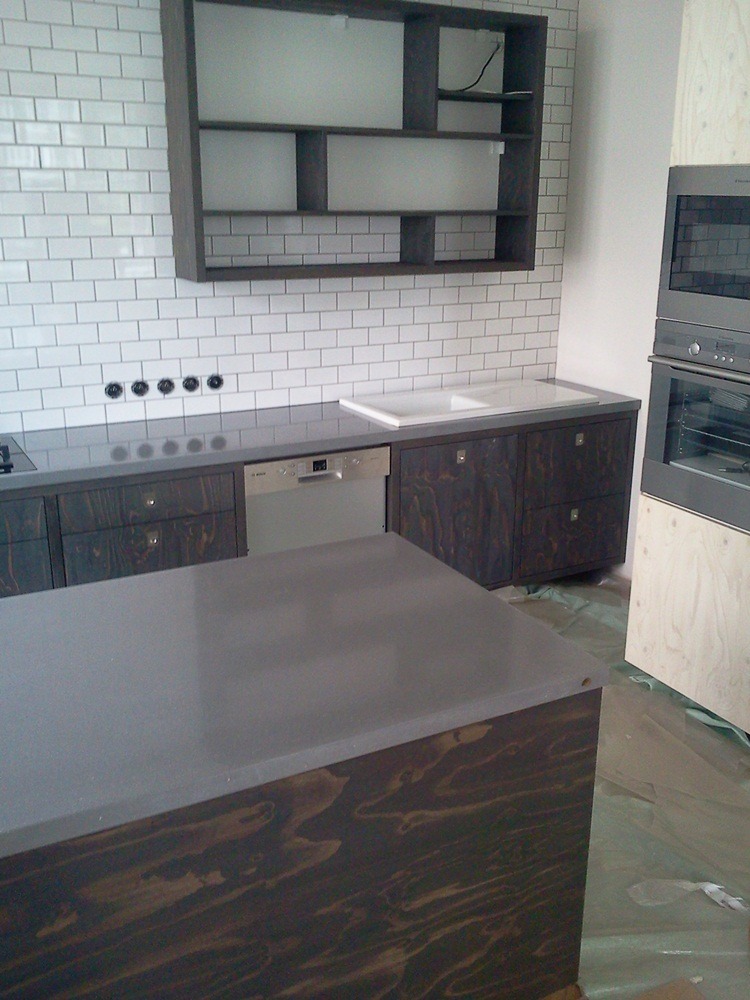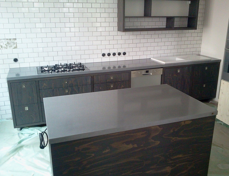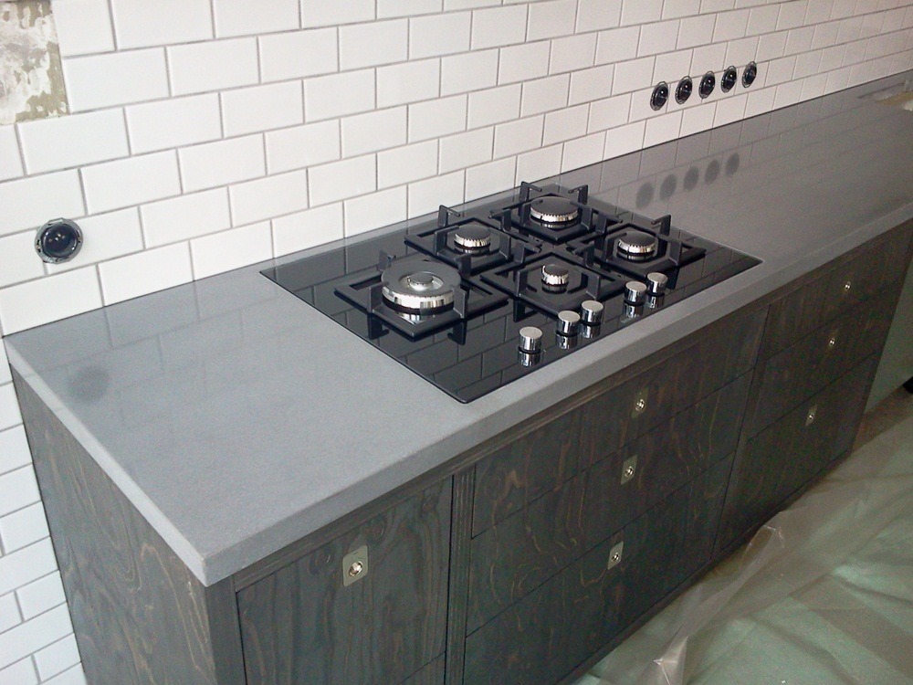 Kitchen unit, tailor-made for any interior. Its advantage are the dimensions, any length without fissure. Our concrete boards are reinforced by a steel reinforcement and kari network. Thanks to this fact, we may rely on its resistance and strength. For this execution, an atypical gas board was used, embedded into the plane with concrete.
