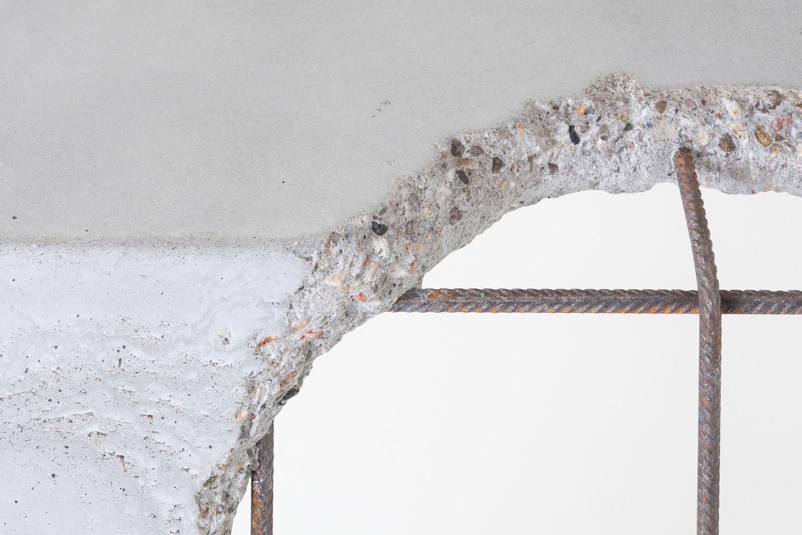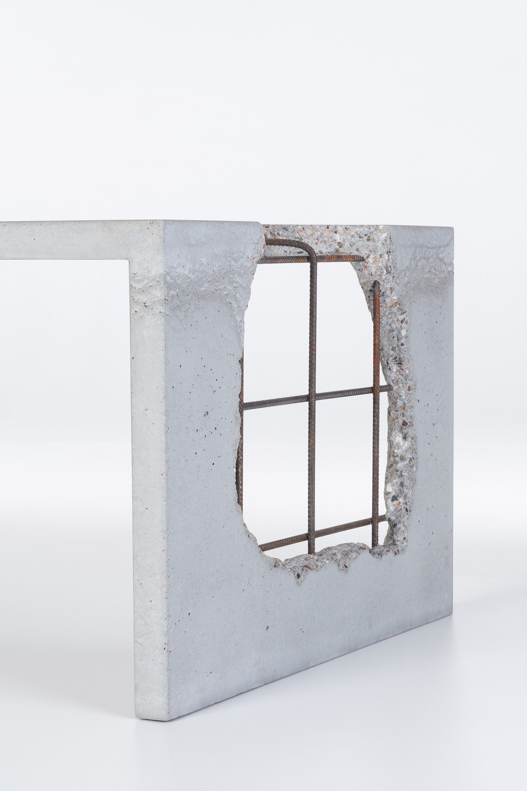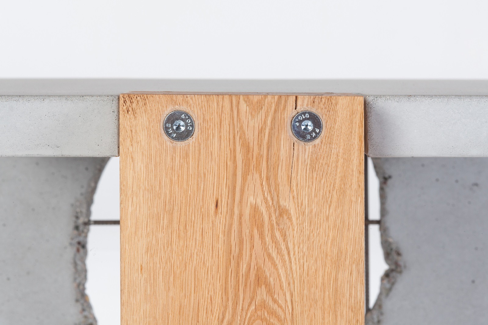 Konferenční stolek CRASH. Velmi surový design betonu, přiznané ocelové výztuže. Ocel není povrchově upravená a postupem času získá patinu rzi. Dubový trám je je olejovaný pro snadné čištění. Celý povrch stolku je ošetřen naší impregnací, která odolává skvrnám. Každý odlitek stolku je originál. Nikdy nebudou dva stejné otvory ve stolku. Ruční práce se sbíječkou.