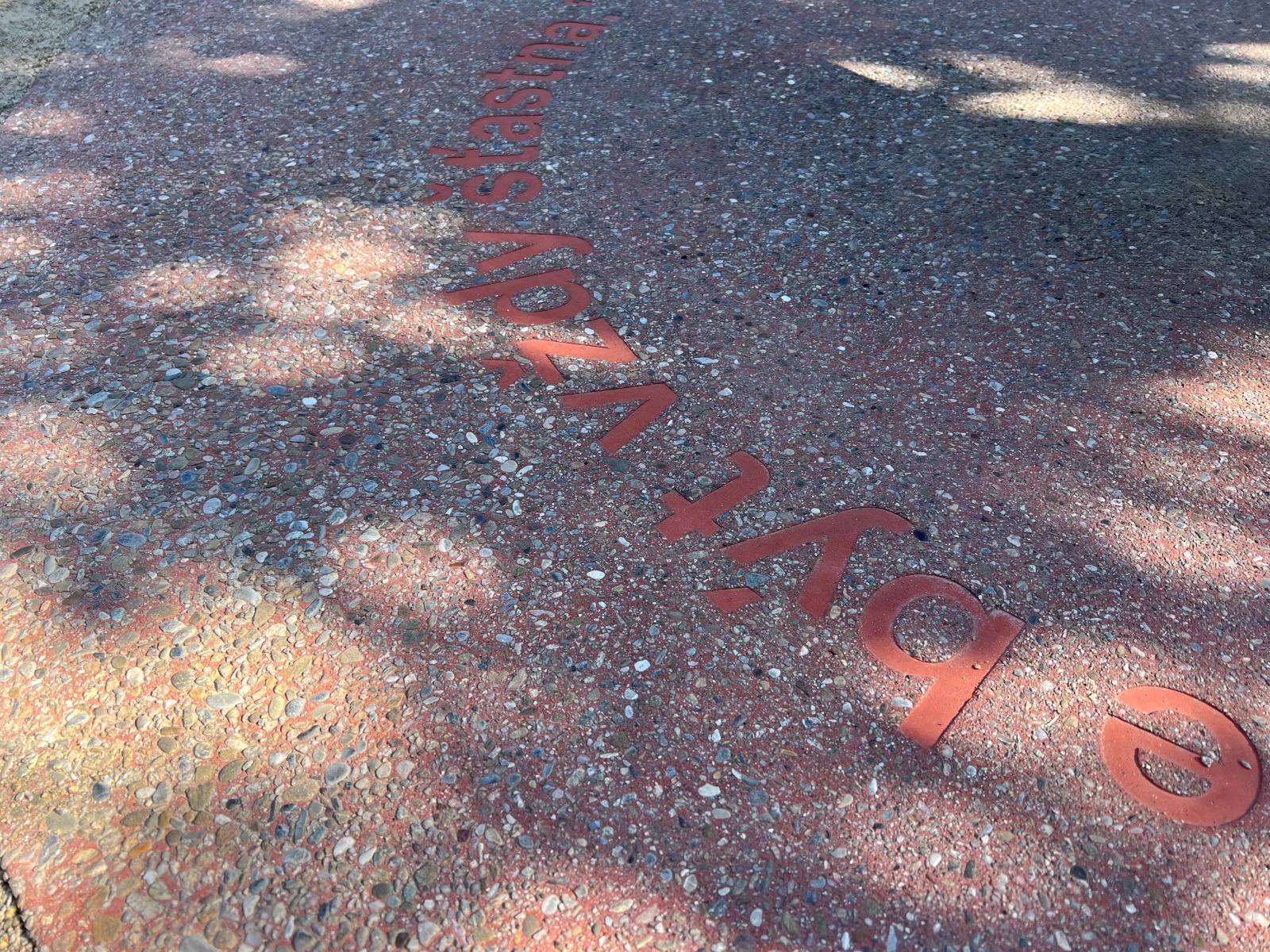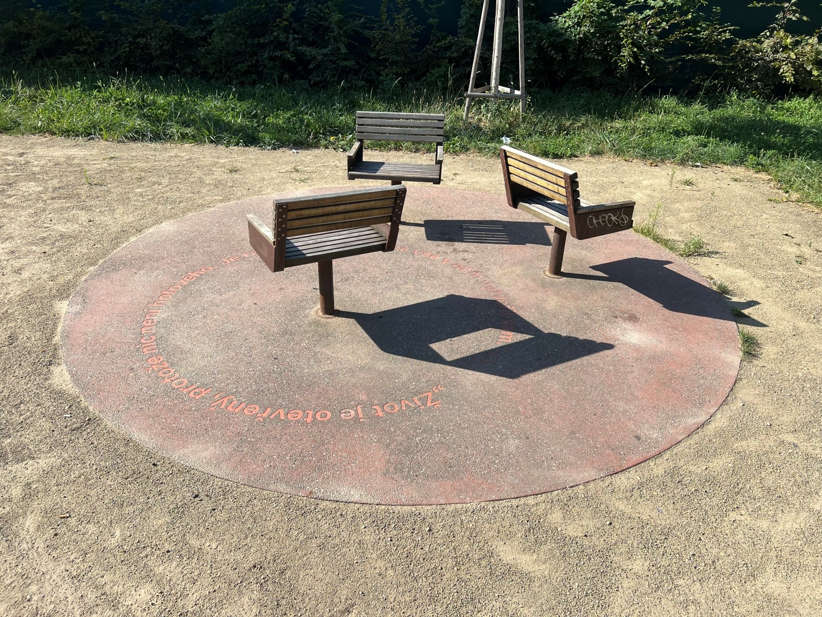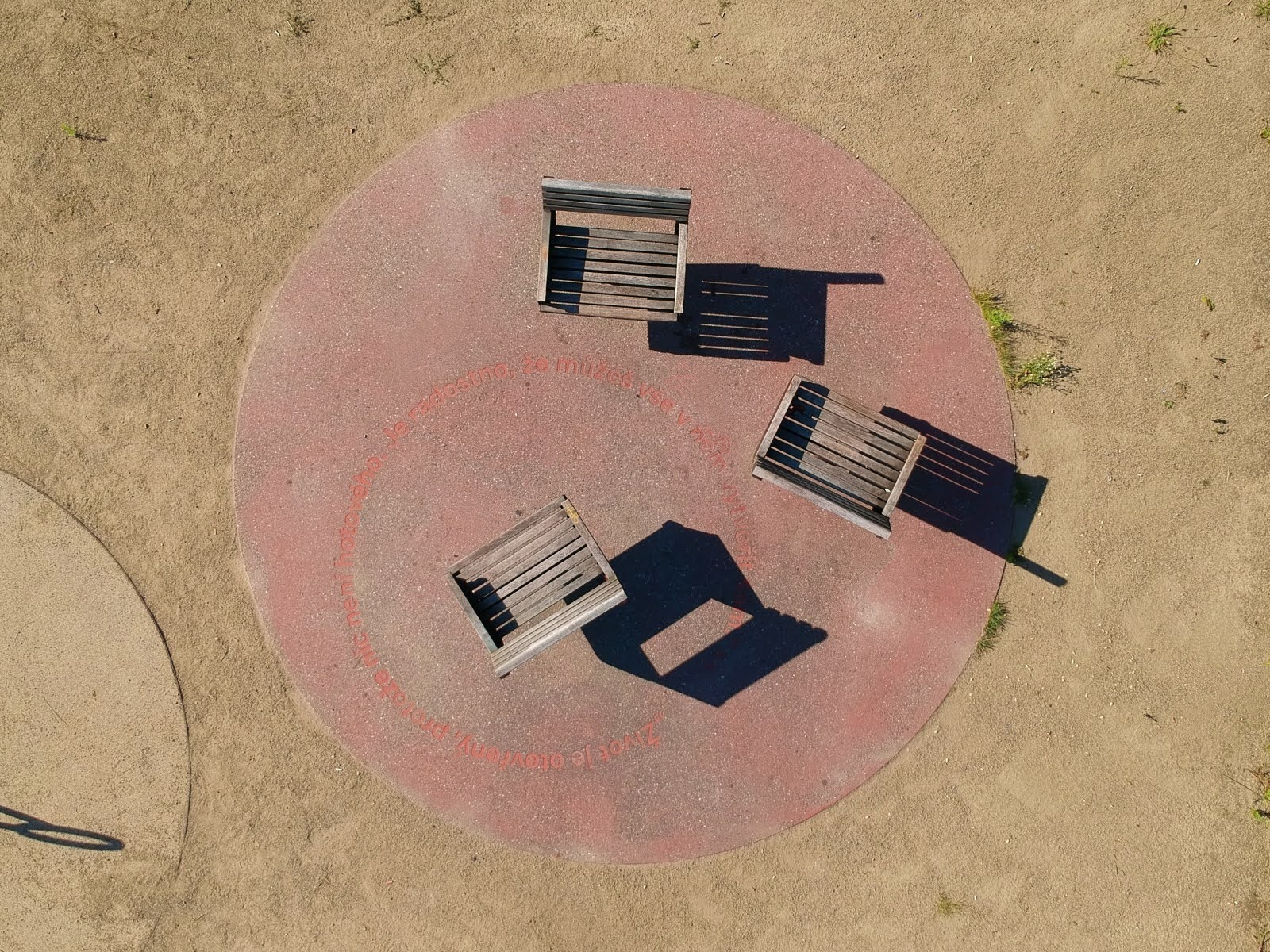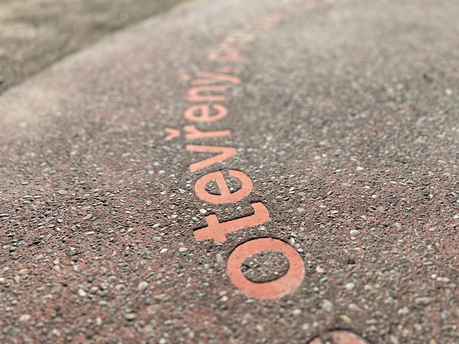 Velkoformátové kruhové  dlaždice v parku v Brně. Dlaždice mají nápisy do kruhů tvořené kombinací hladkého povrchu a retardovaného povrchu.