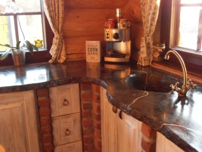 Tento typ betonové pracovní desky jsem vytvářeli přímo v kuchyni u klienta. Ten byl přítomen u finální vrstvy barev a doladil s námi desku osobně. Speciální druh barev se nanáší na vlhký povrch betonu a po hydrataci cementu se pevně spojí s deskou. Celek pak uzavře naše speciální hybridní impregnace. Takto upravená deska je klenot do kuchyně.