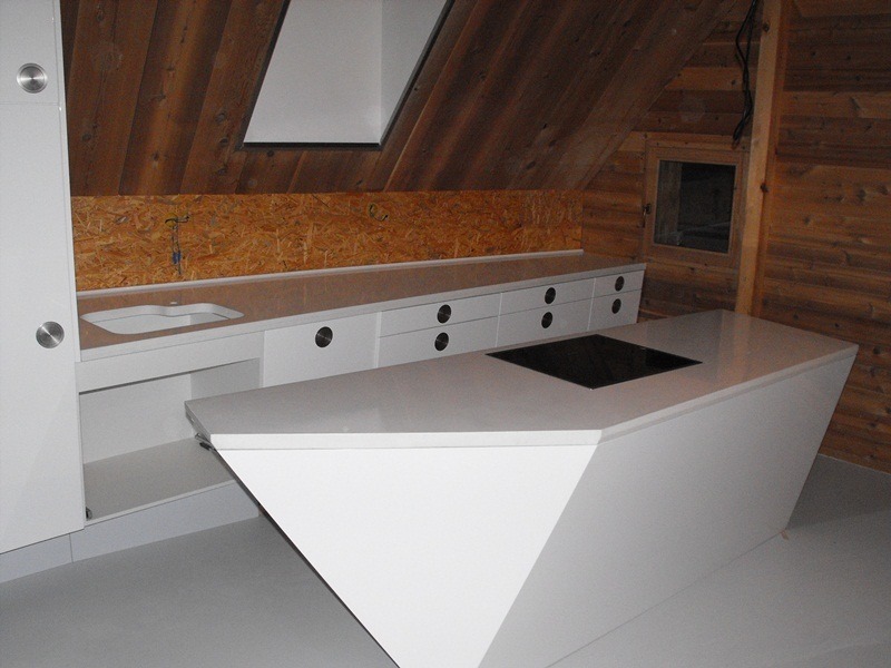 Betonovou desku navrhl MgA. Přemysl Kokeš do krásného interiéru v půdní vestavbě. Hrany desky mají atypický tvar a protahují úhel spodního korpusu. Tím vzniká 3D efekt tenkého provedení desky z pohledu ve správném úhlu.