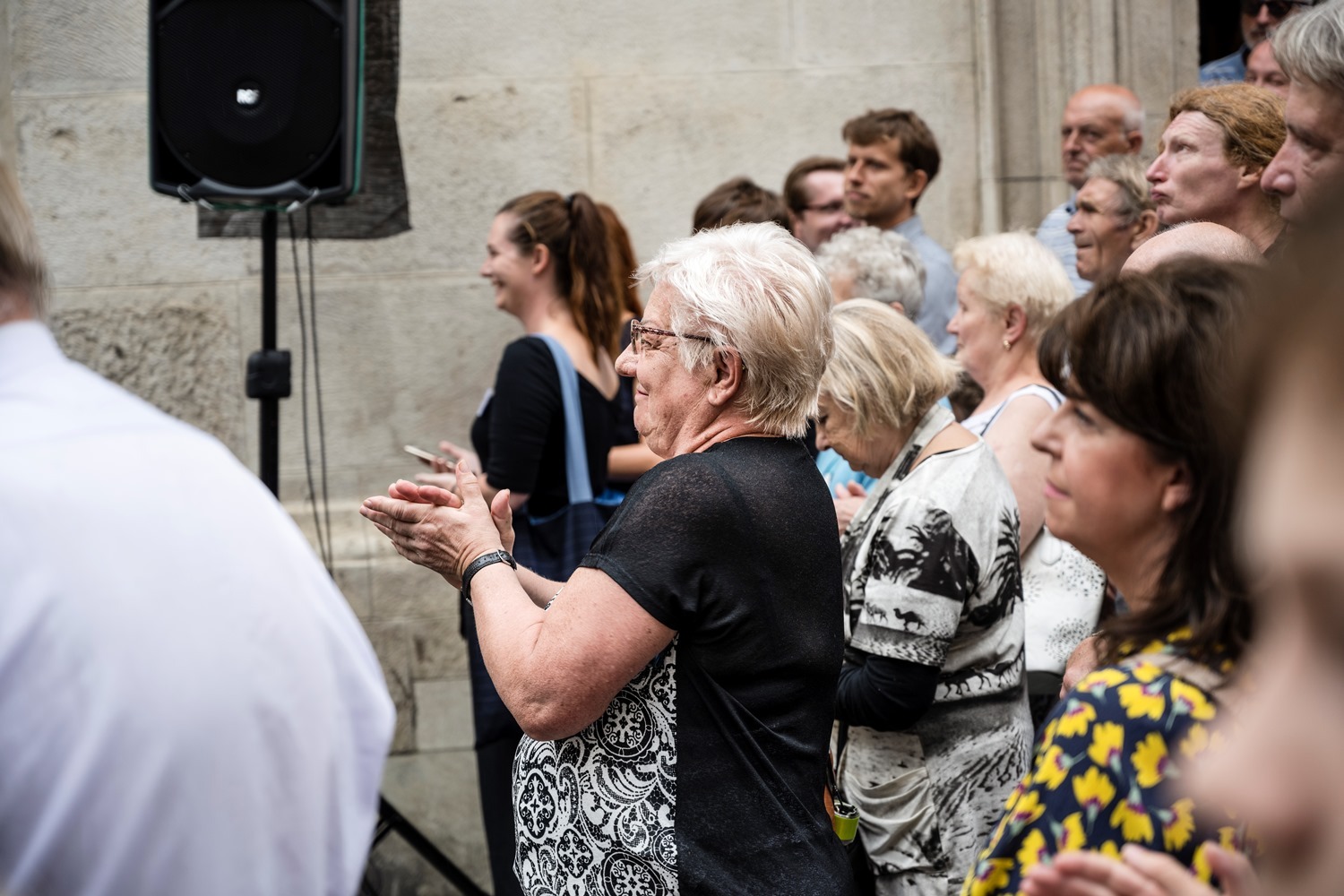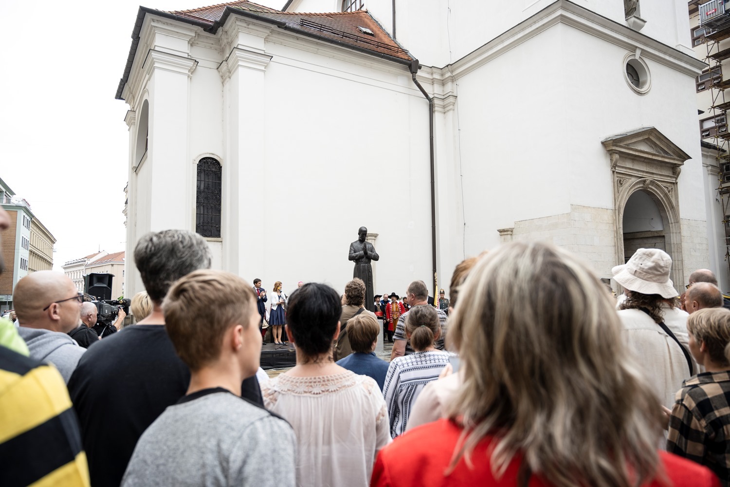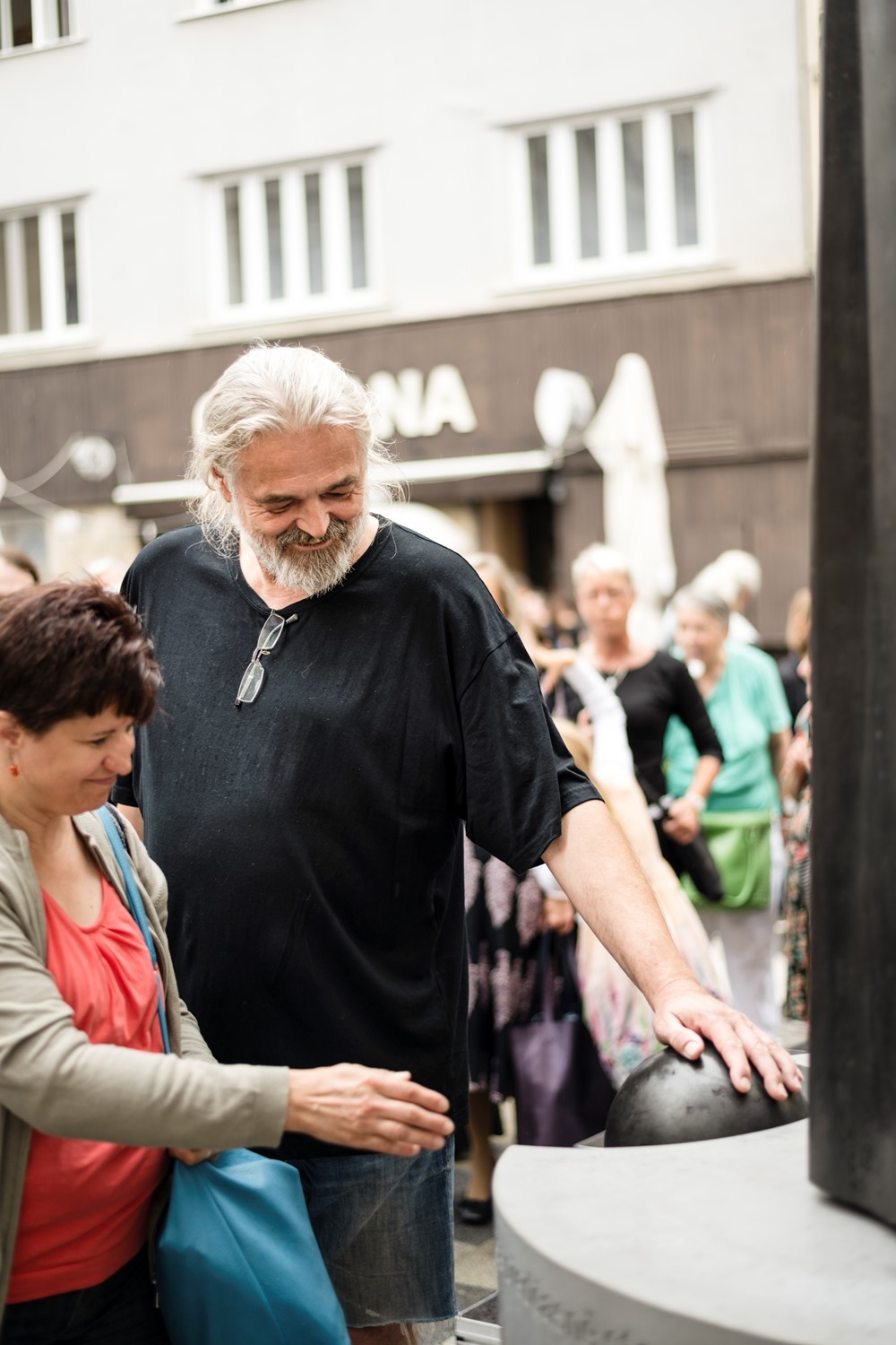 Podstavec pro sochu pátera Martina Středy v sobě skrývá nosnou konstrukci. Podstavec z našeho leštěného betonu je dutý s tloušťkou stěny 70mm. Nejtěžší část bylo detailně zpracované písmo na obvodu celého podstavce. Formu pro písmo jsme vyráběli na vodním paprsku v Brně. Součástí dodávky byla i naše instalace v centru Brna.