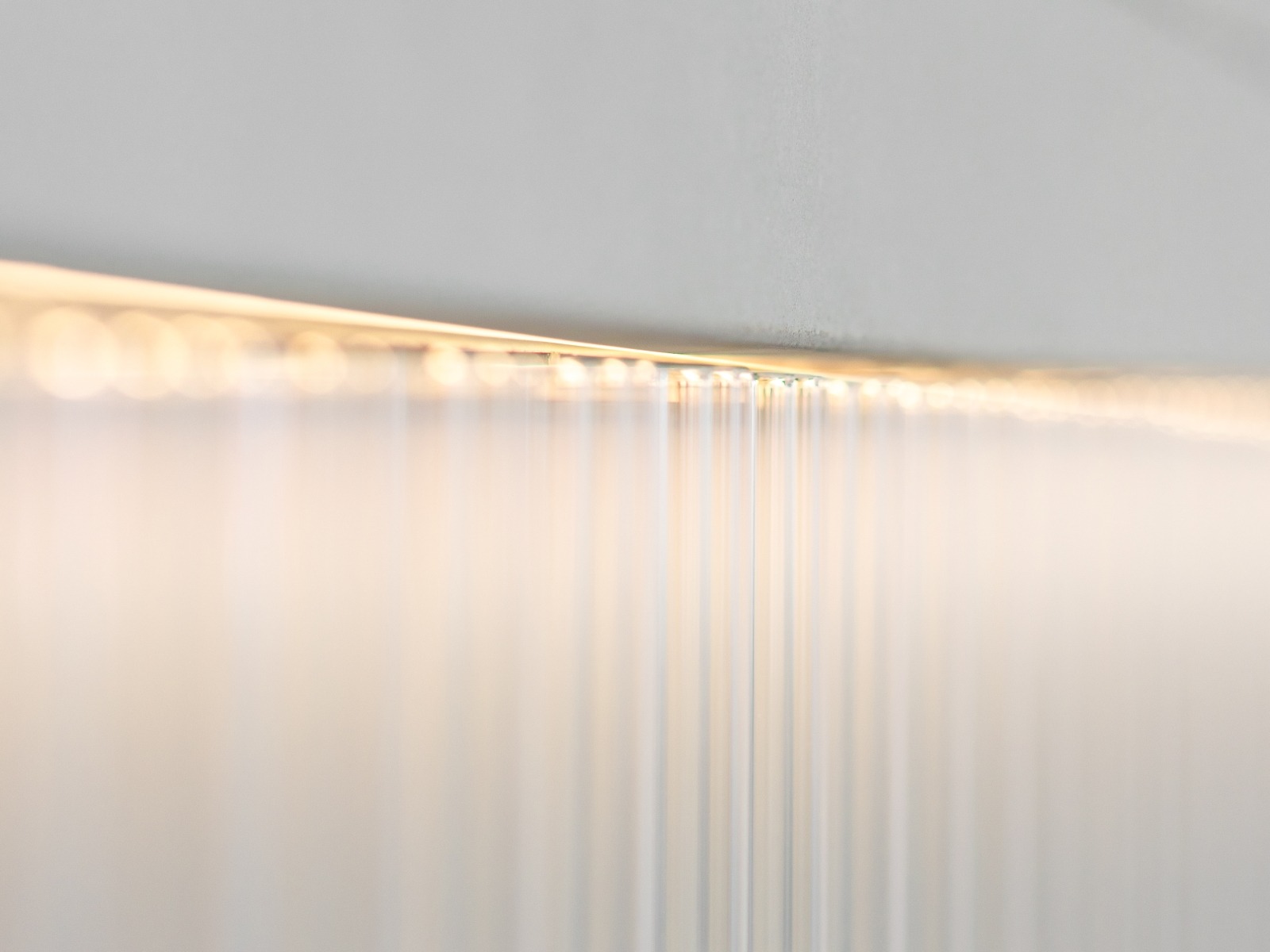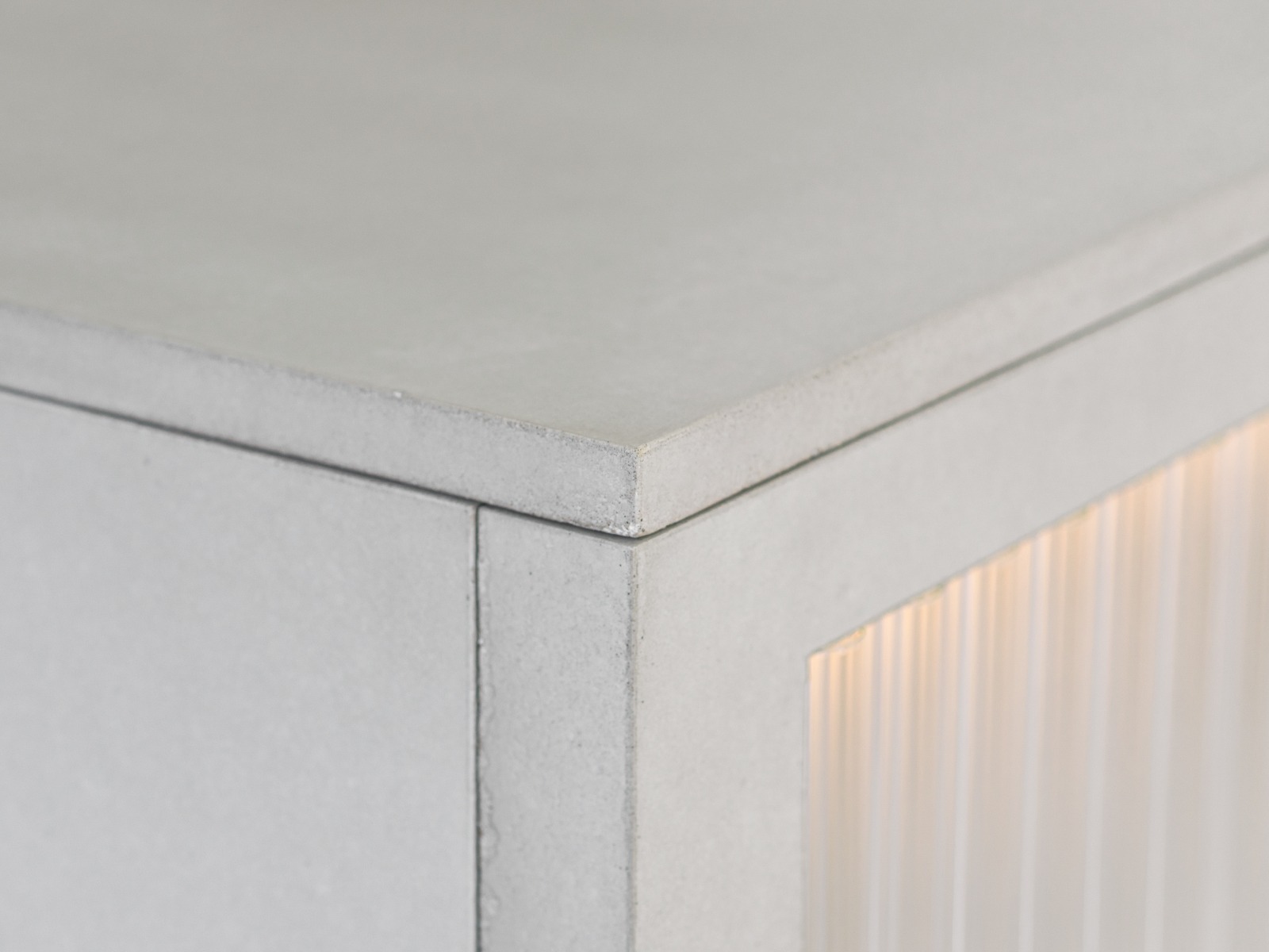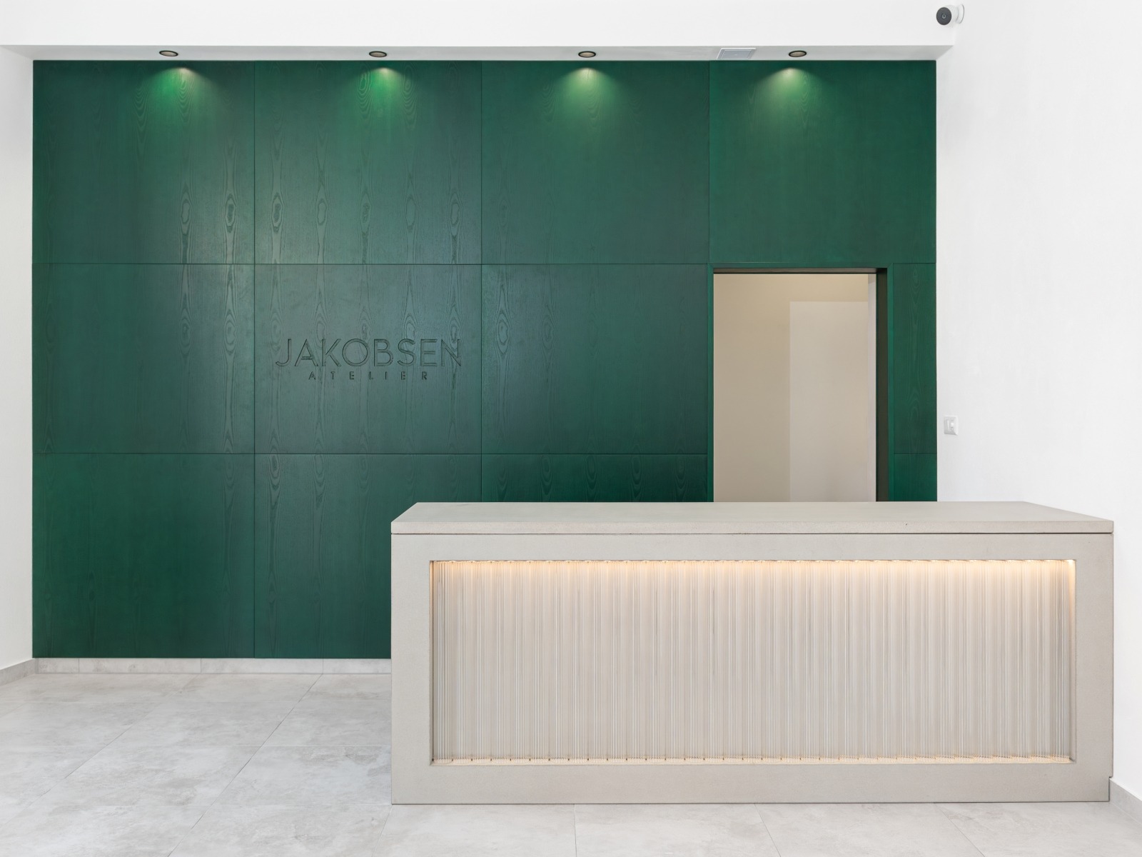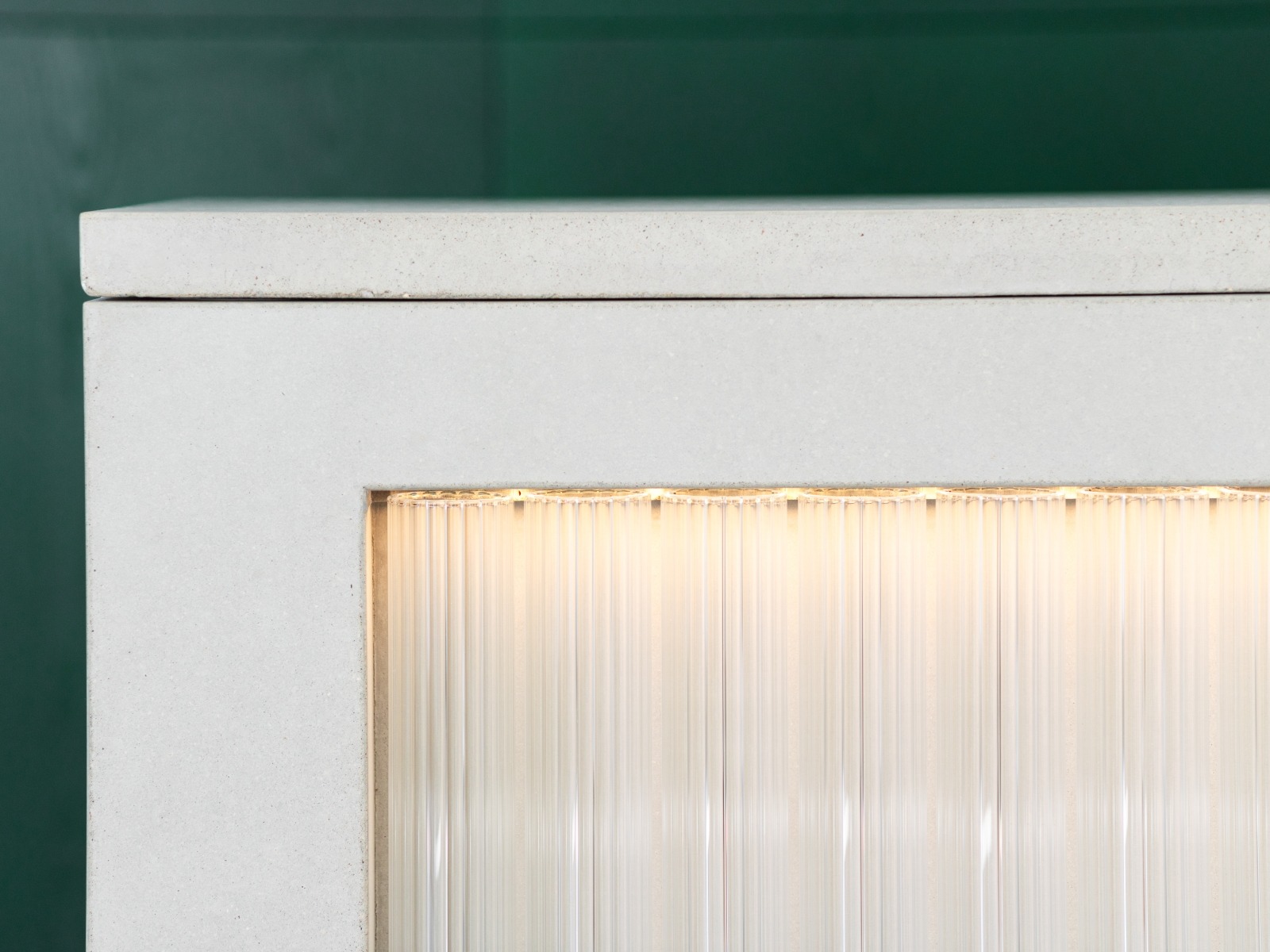 Prodejní pult z betonu v Ateliéru Jakobsen. Kombinace betonu skla a světel. Tunové dílo s křehkým detailem skleněných trubic.