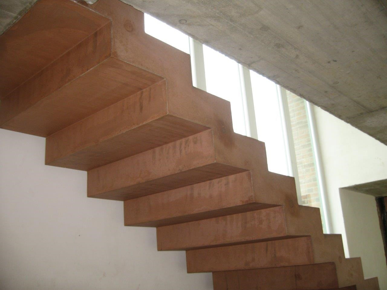 Klasická konstrukce schodiště s tloušťkou 15 cm. Betonáž samonosných ramen schodiště byla provedena probarvenou směsí betonu od TBG Metrostav. Barevný pigment dodala firma Sika. Naše firma si vyhrála s bedněním, které bylo postaveno na boku, abychom docílili co nejvíce pohledových ploch prefabrikátu. Díky tomuto spojení mohly vzniknou tyto dva krásné solitérní kousky schodiště.