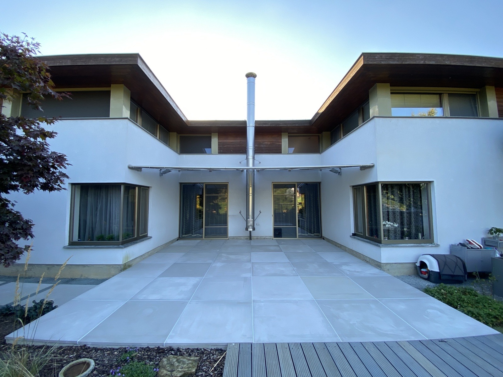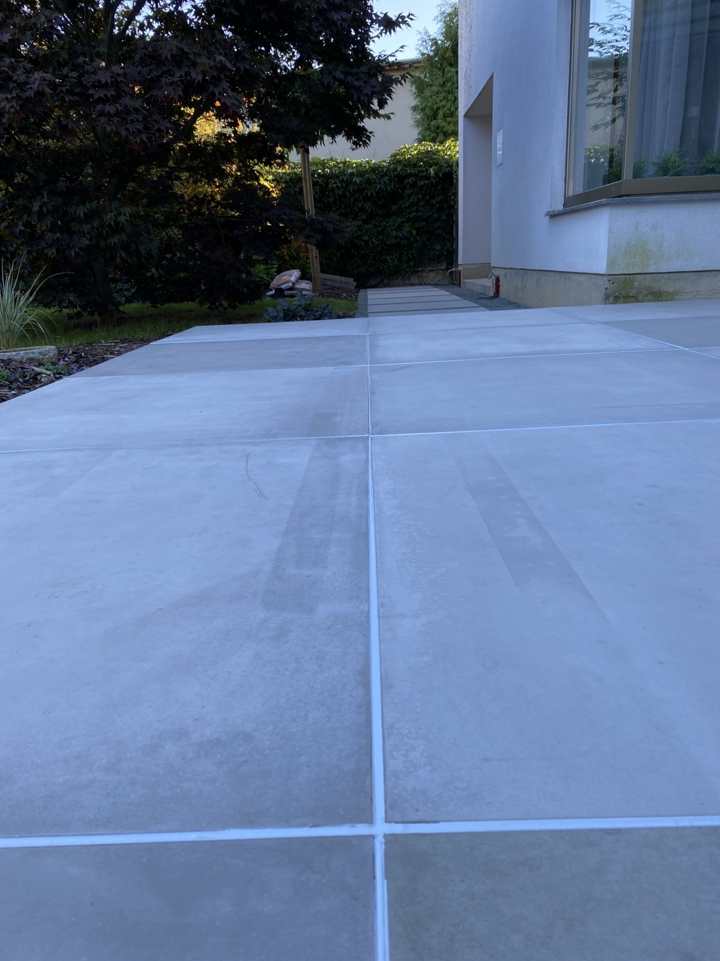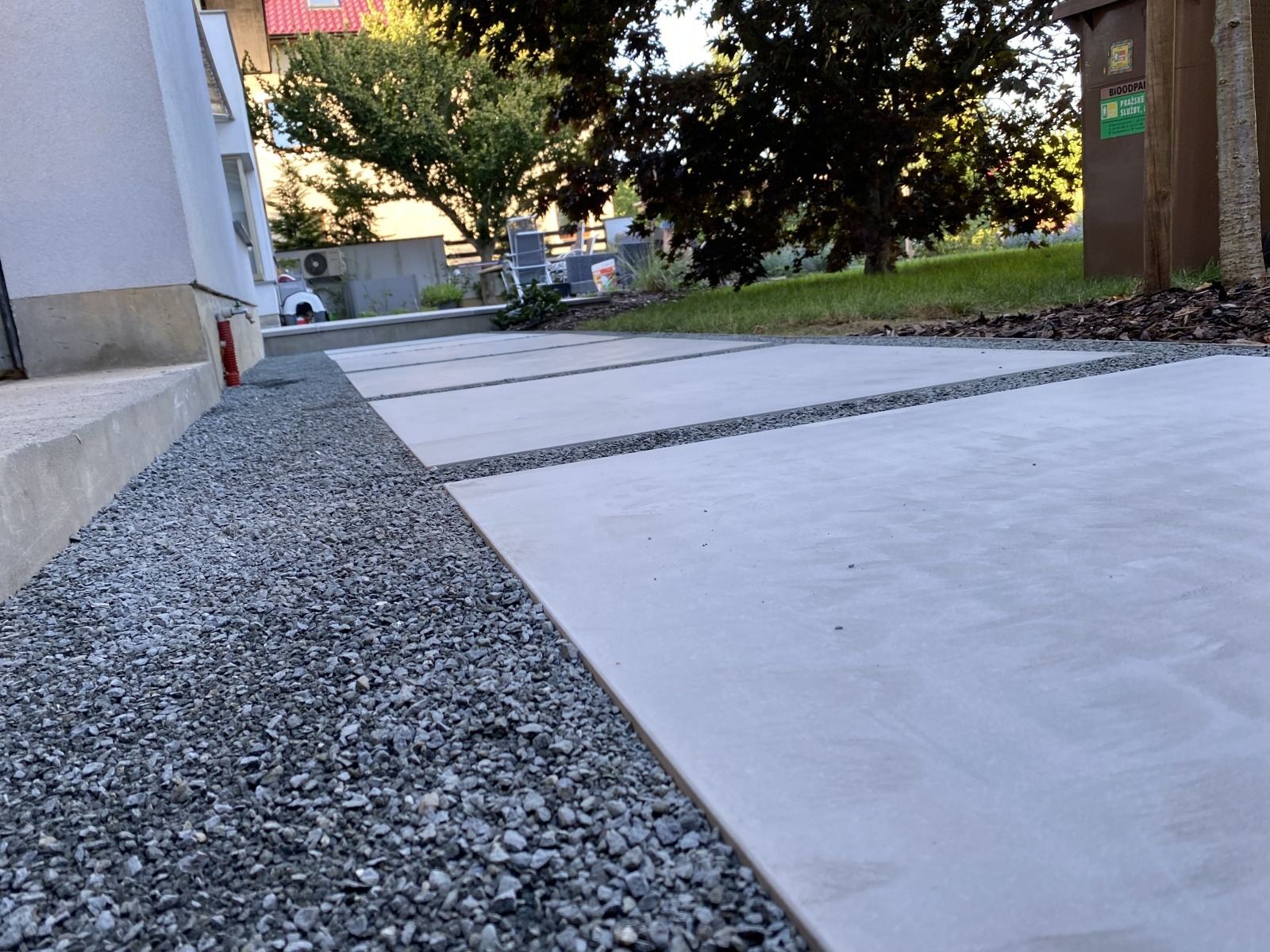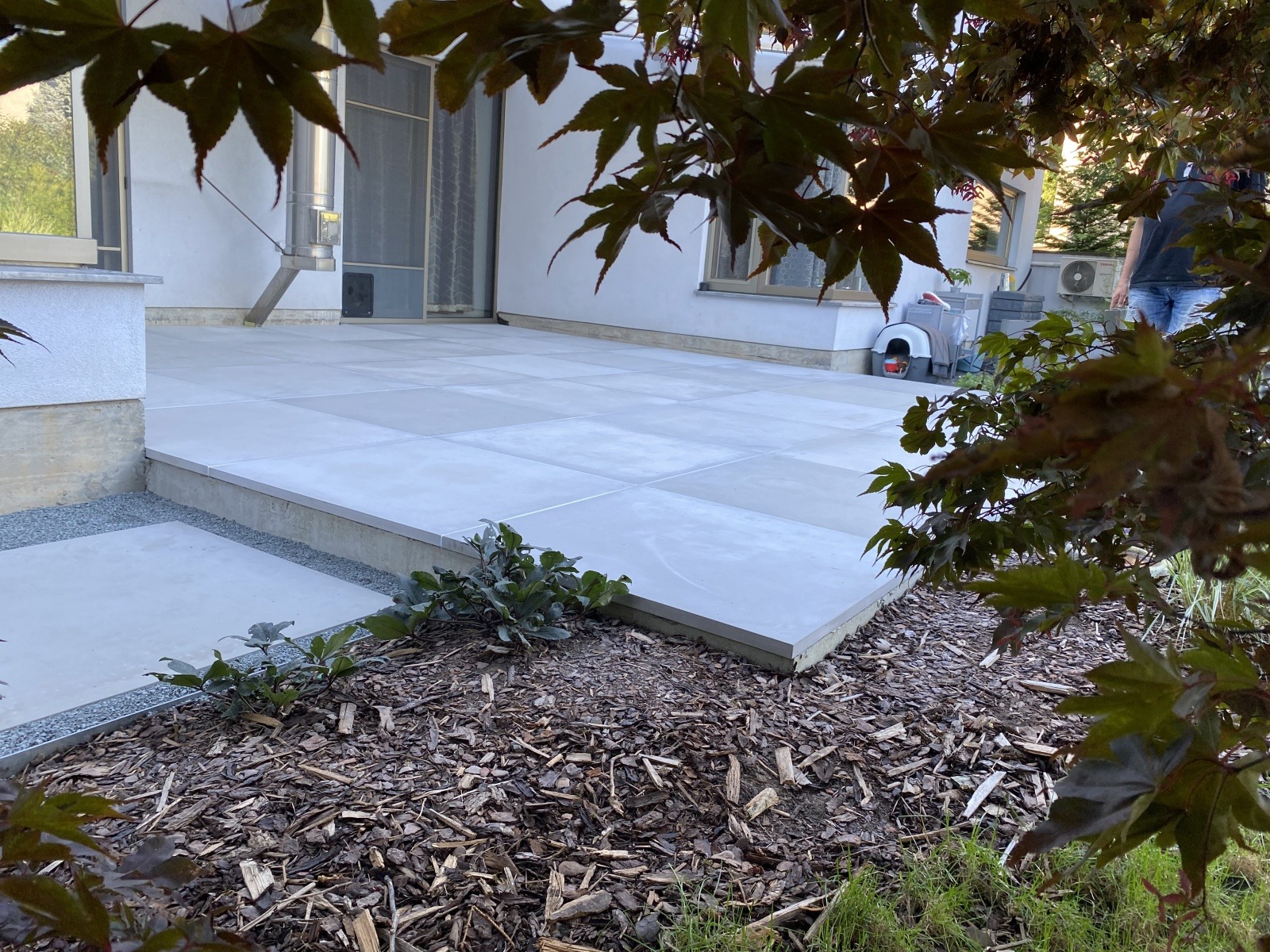 Velkoformátové dlaždice lepené na podkladní beton. Dlaždice jsou rozměru 1110x1110x30 mm. Dlaždice jsme vyrobili z UHPC betonu. Kvůli vysokému podkladu se projekt musel vlézt do výšky 40mm včetně lepení. Nebylo co řešit, betonová dlaždice 1,23m2 se vyrobí v tloušťce 30mm.