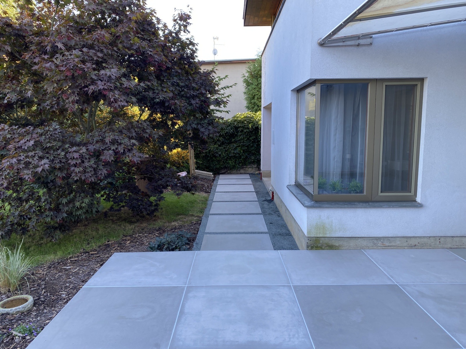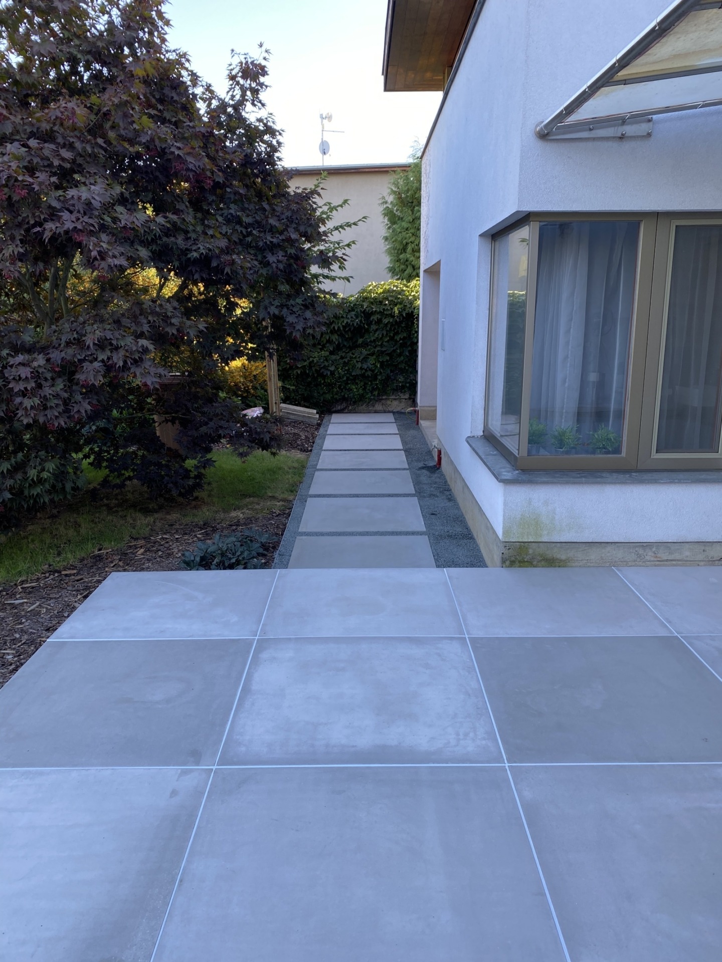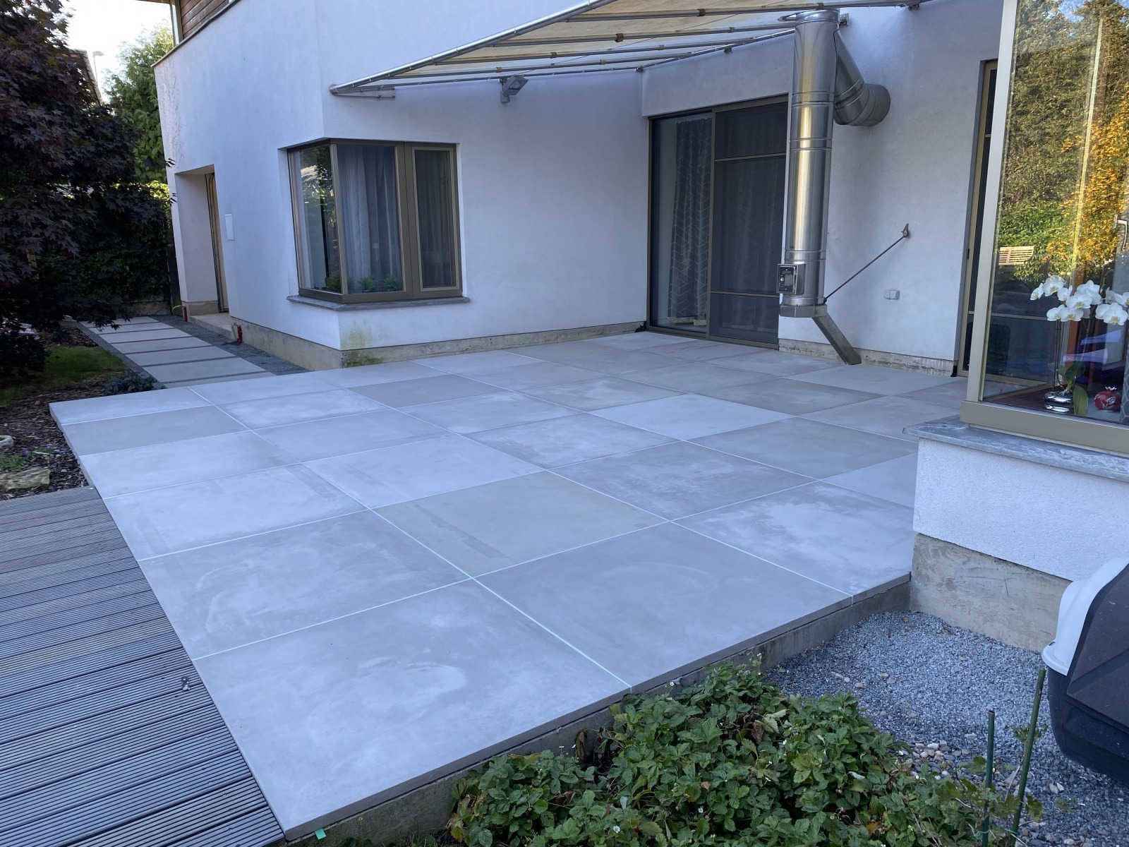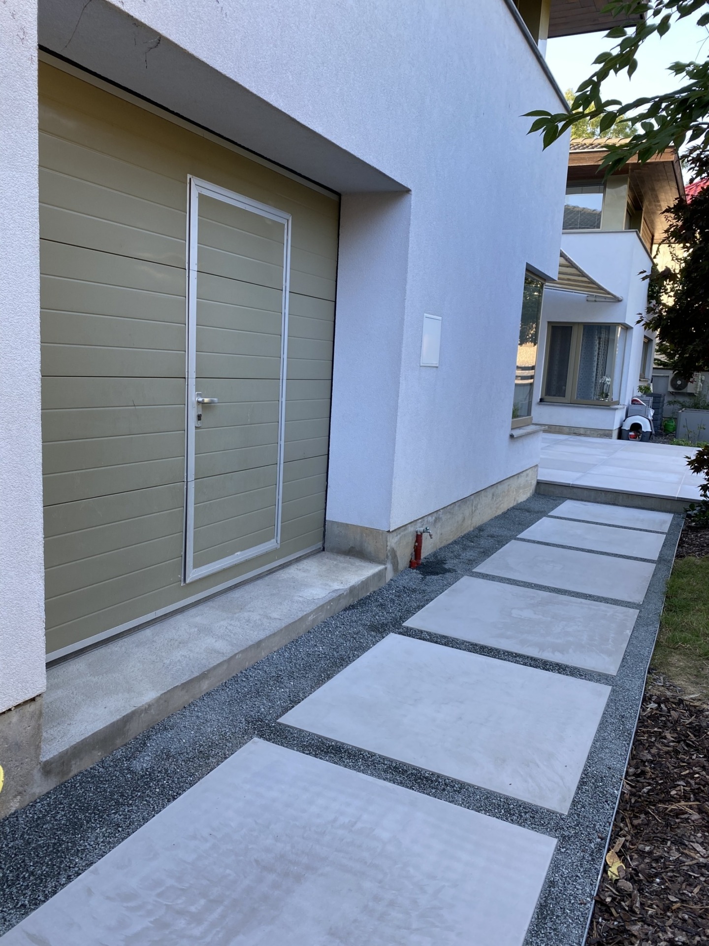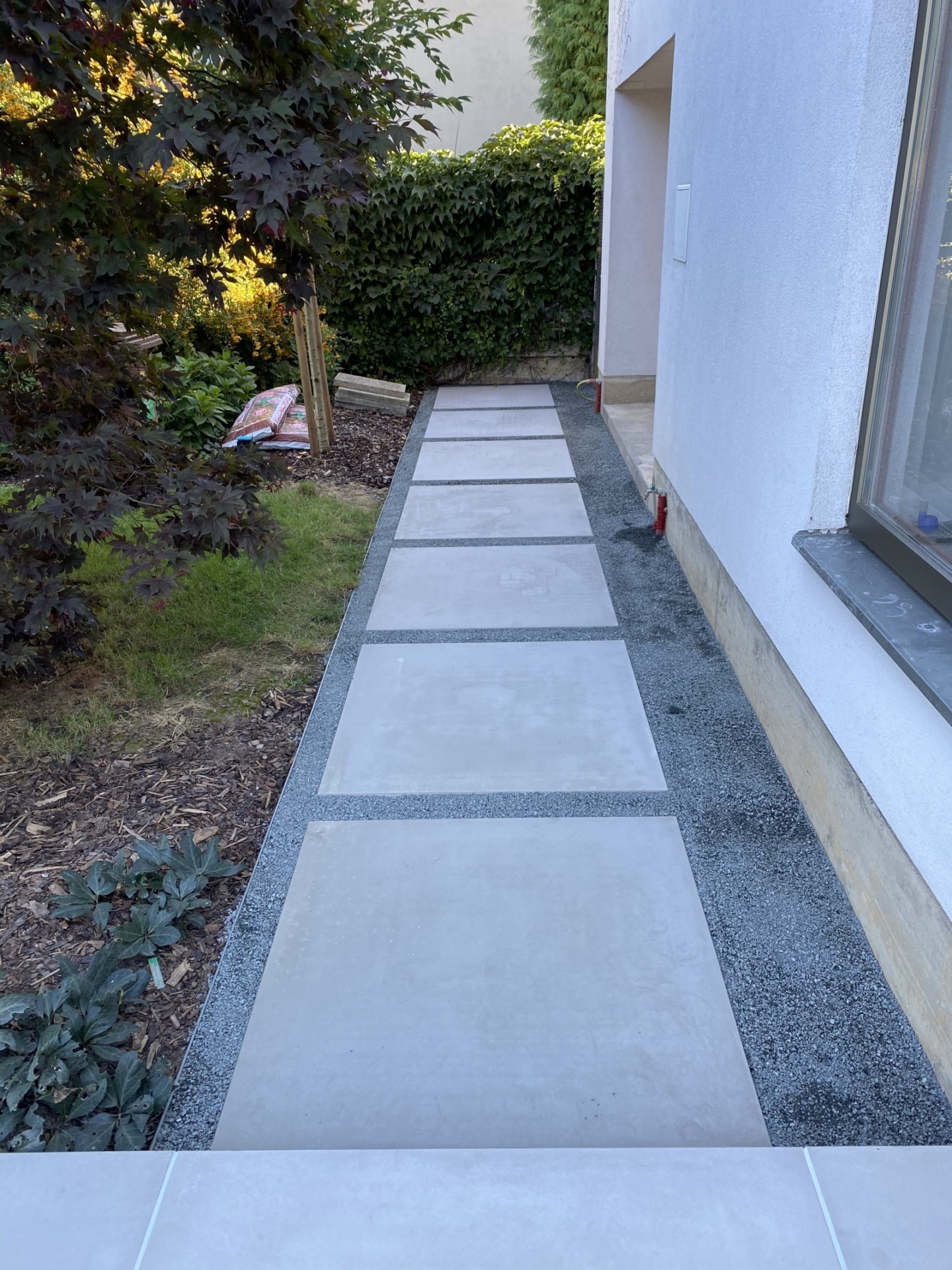 Velkoformátové dlaždice lepené na podkladní beton. Dlaždice jsou rozměru 1110x1110x30 mm. Dlaždice jsme vyrobili z UHPC betonu. Kvůli vysokému podkladu se projekt musel vlézt do výšky 40mm včetně lepení. Nebylo co řešit, betonová dlaždice 1,23m2 se vyrobí v tloušťce 30mm.