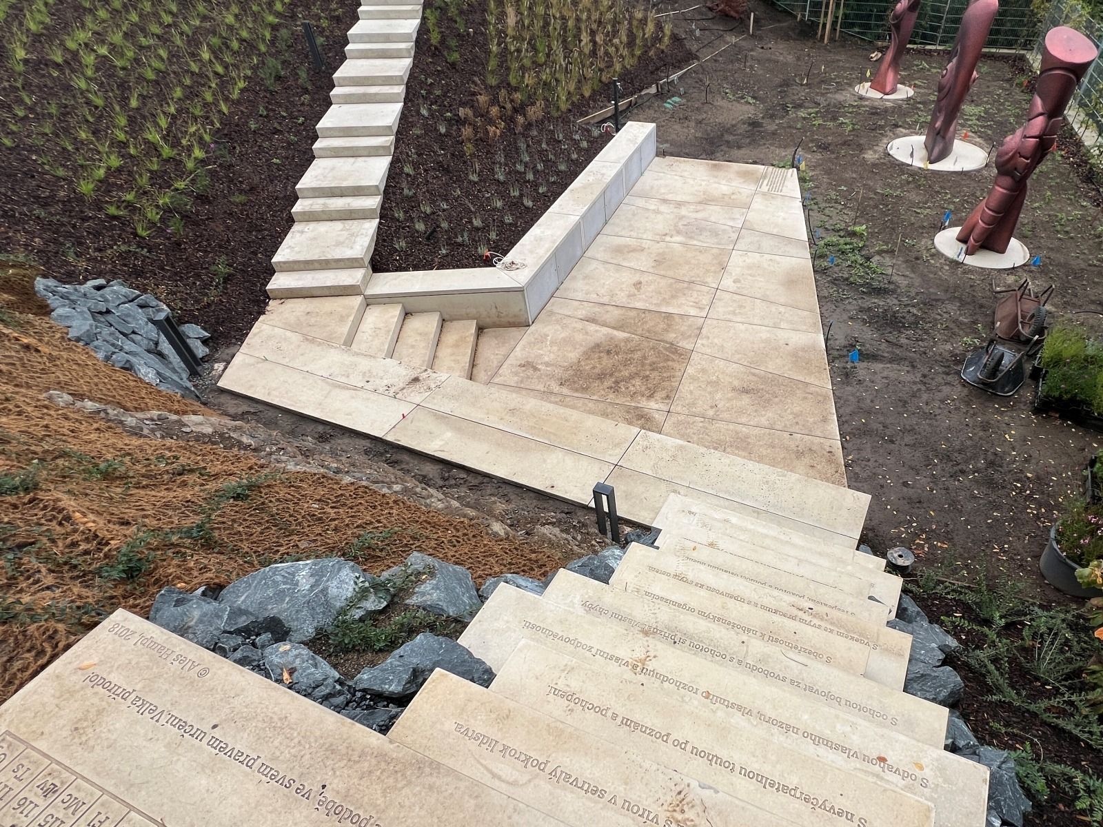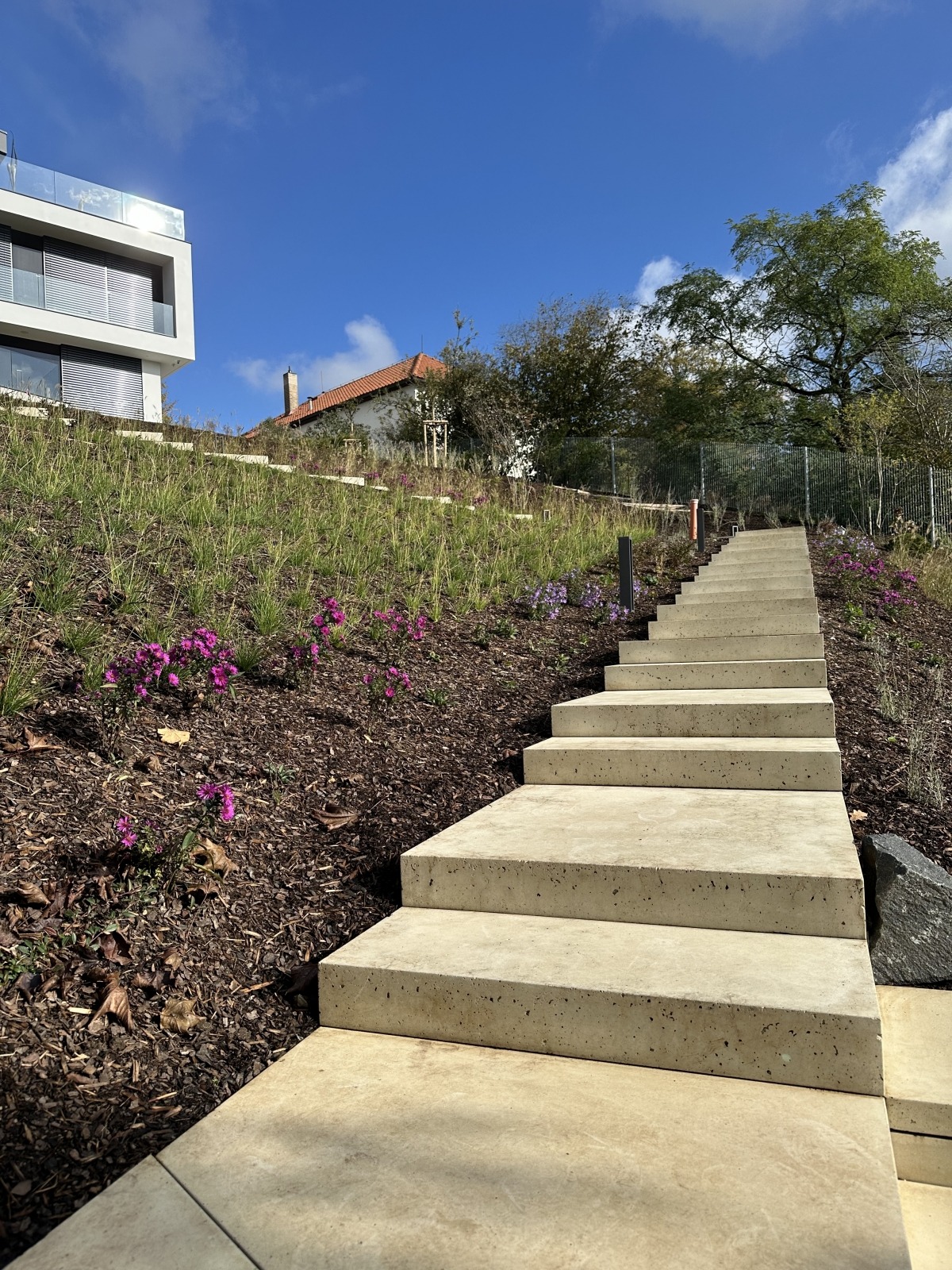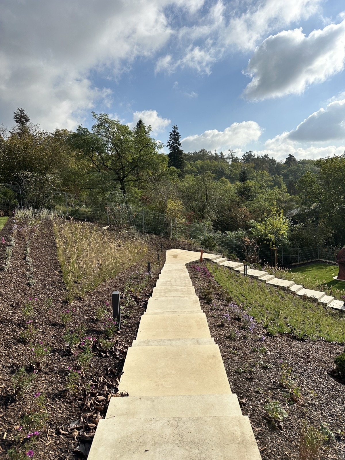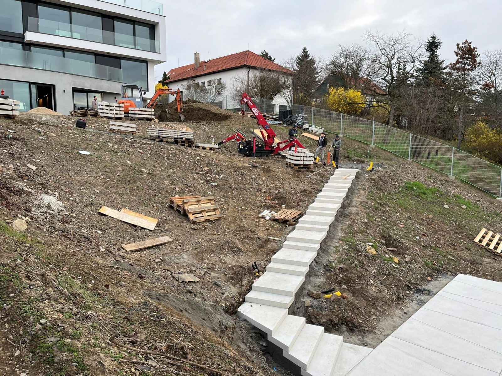 Velkoformátové dlaždice z bílého betonu pro vjezdy a vchody. Velké dlaždice pro jezdecké schody. Graficky beton a největší dlaždice, kterou jsme vyráběli. To vše je v tomto projektu. Krásná soukromá zahrada v Praze. Nás tento projekt naučil logistice, manipulaci a instalaci jeřábní technikou na místě.