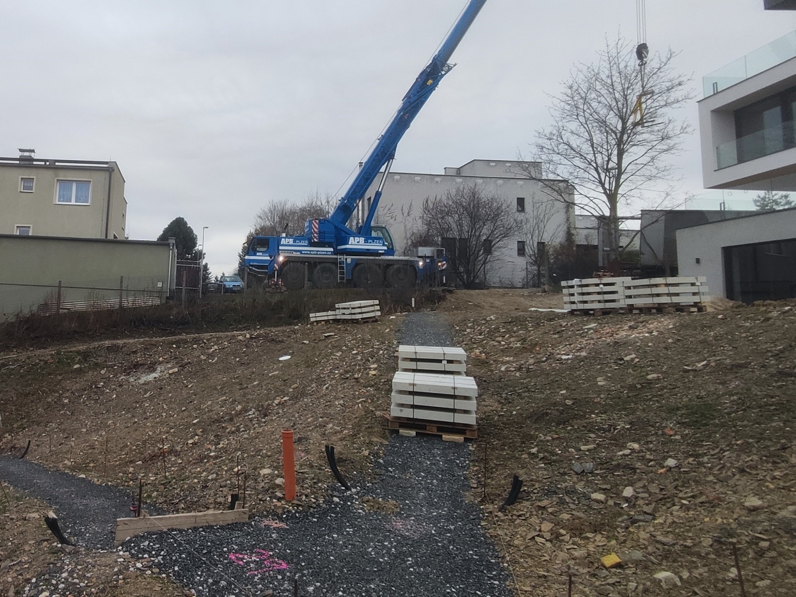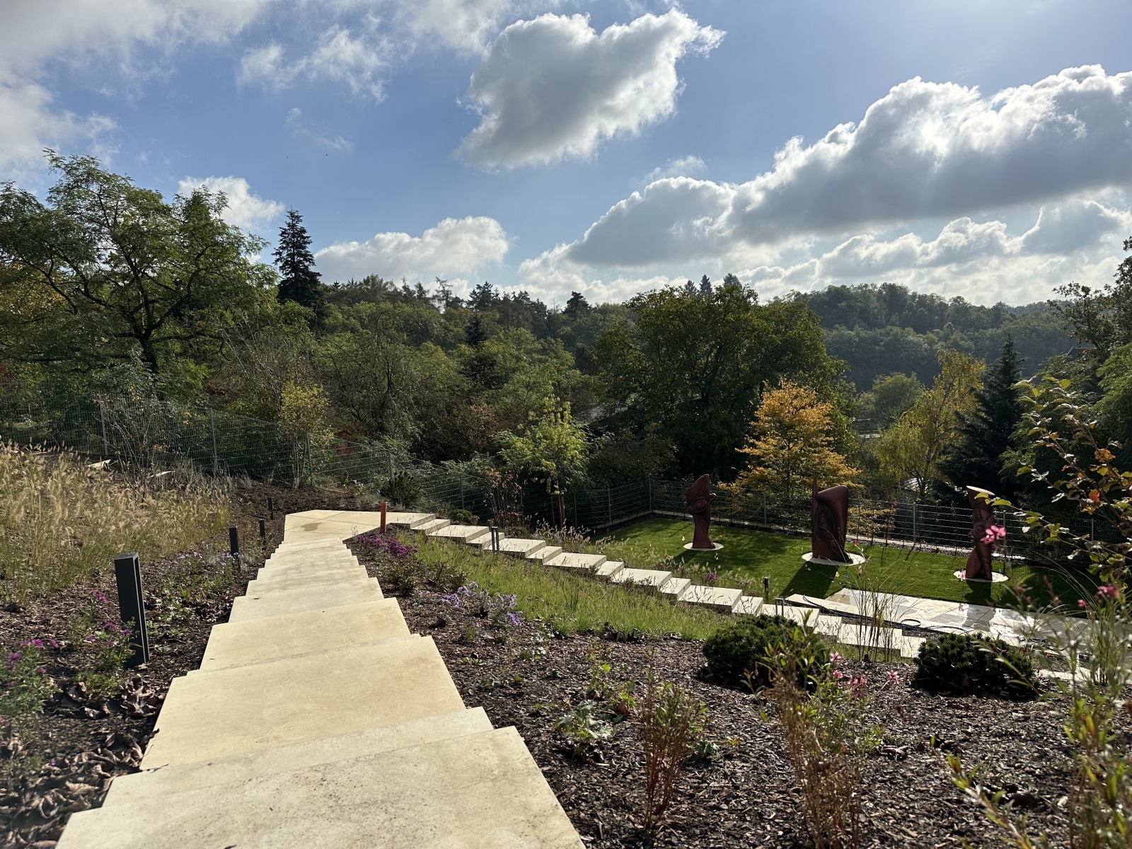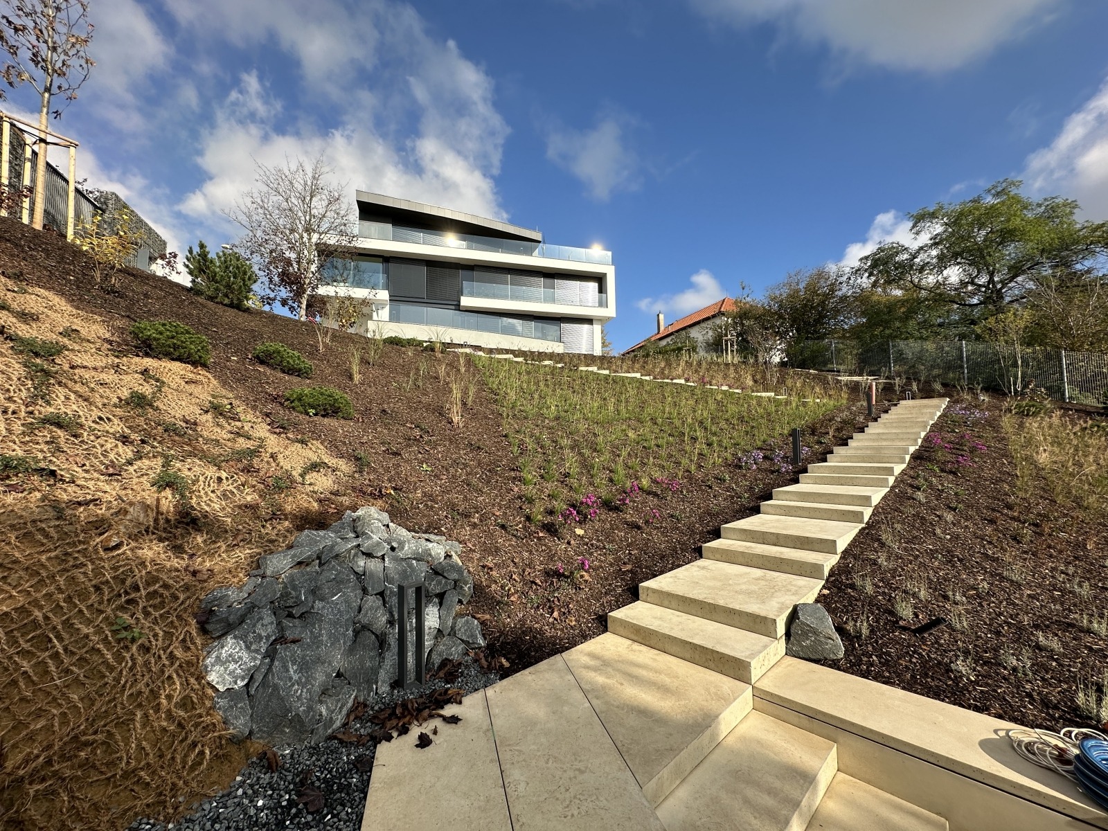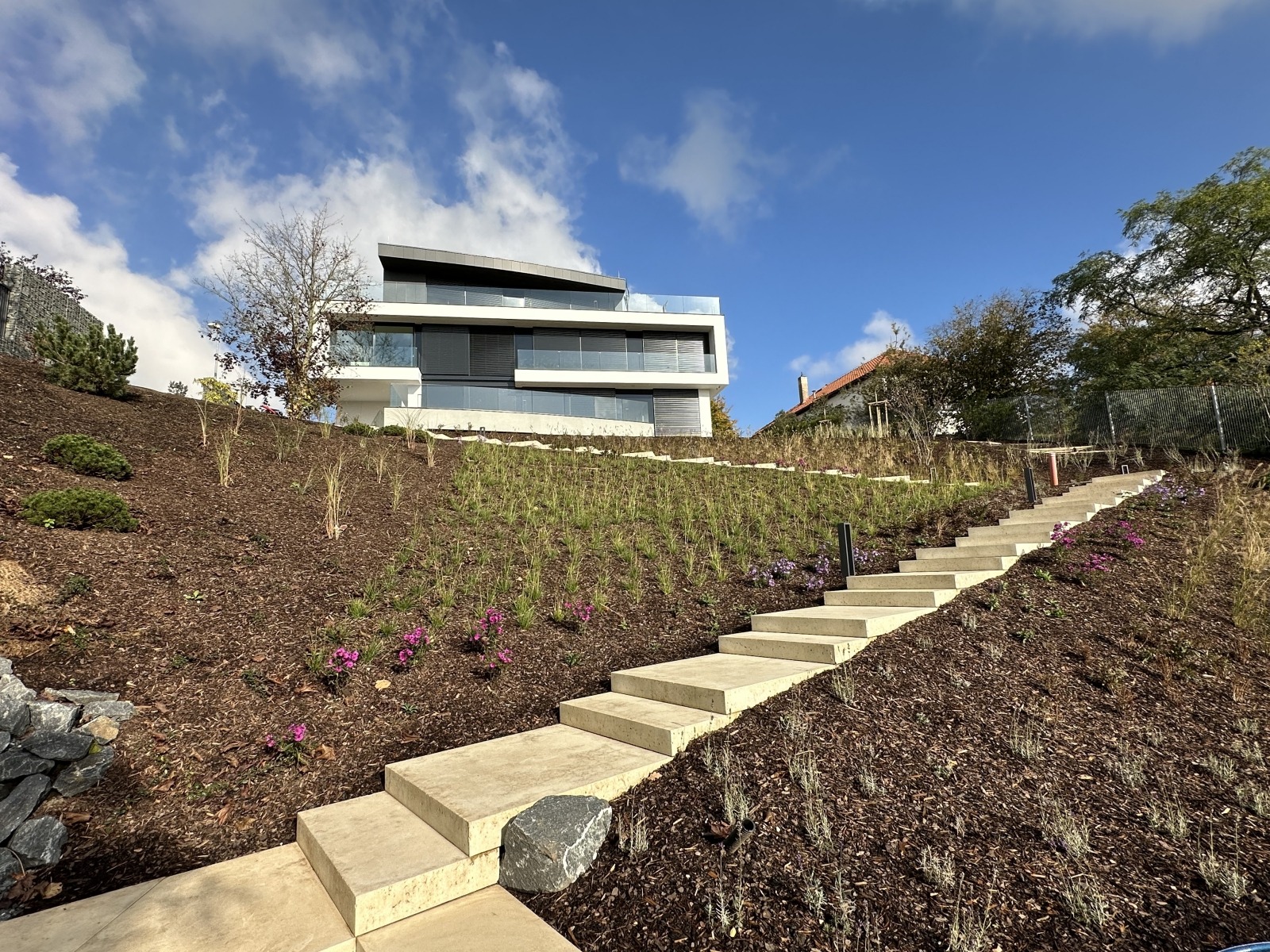 Velkoformátové dlaždice z bílého betonu pro vjezdy a vchody. Velké dlaždice pro jezdecké schody. Graficky beton a největší dlaždice, kterou jsme vyráběli. To vše je v tomto projektu. Krásná soukromá zahrada v Praze. Nás tento projekt naučil logistice, manipulaci a instalaci jeřábní technikou na místě.