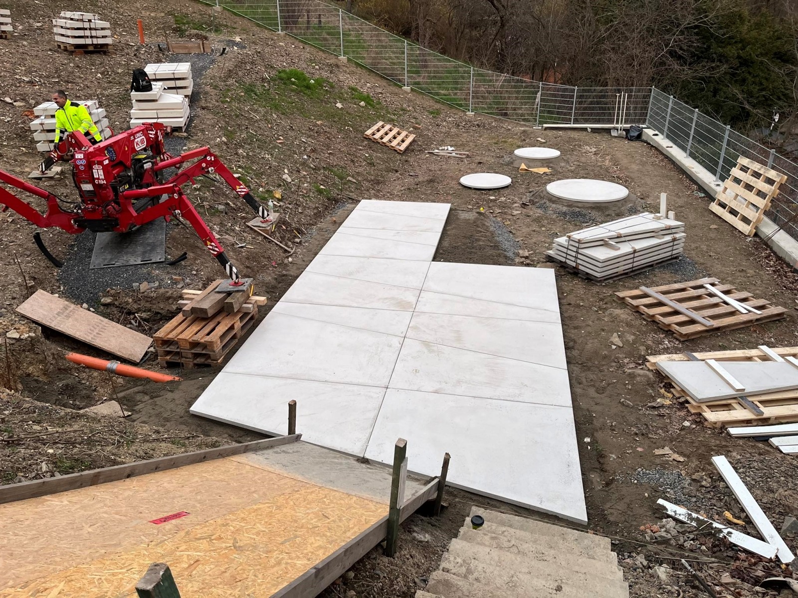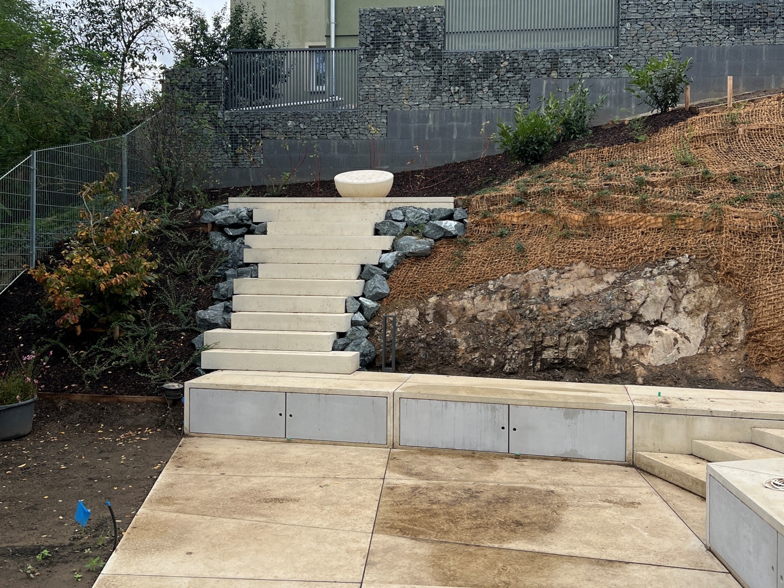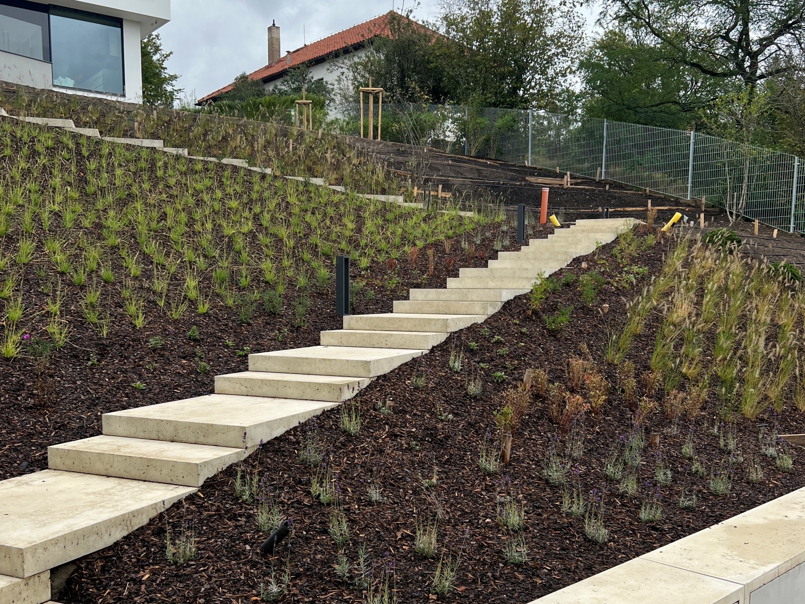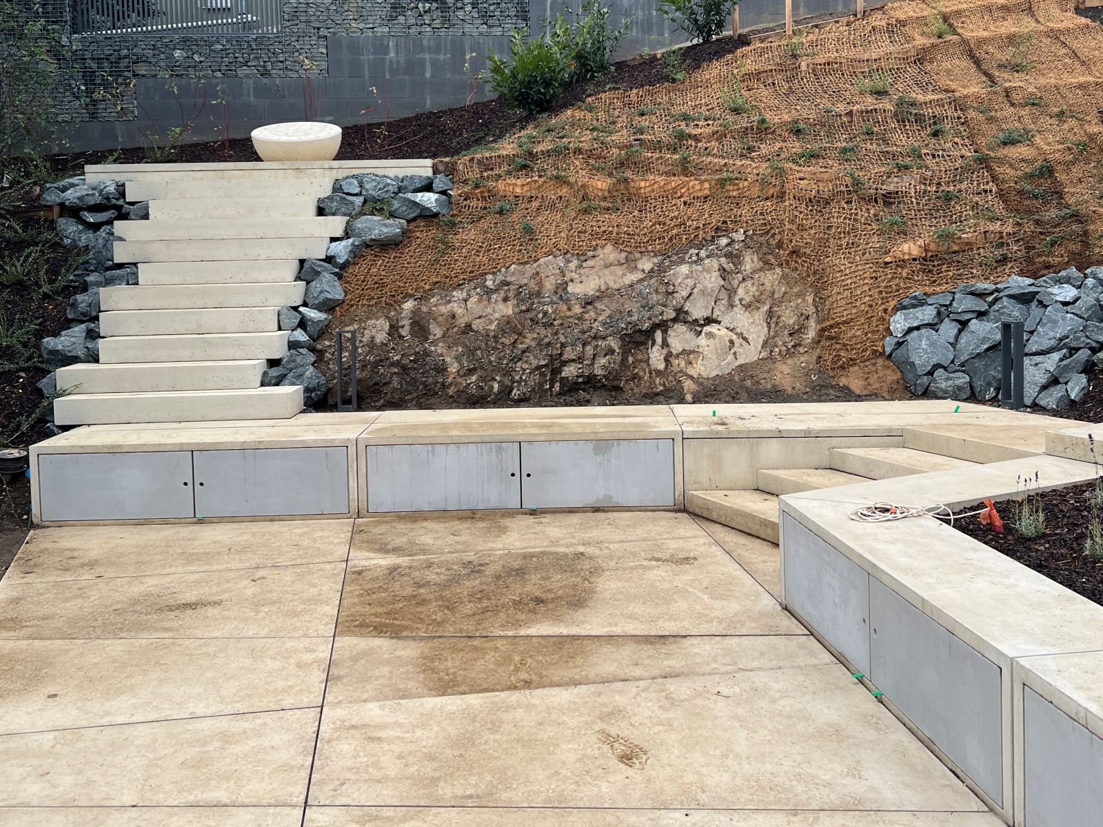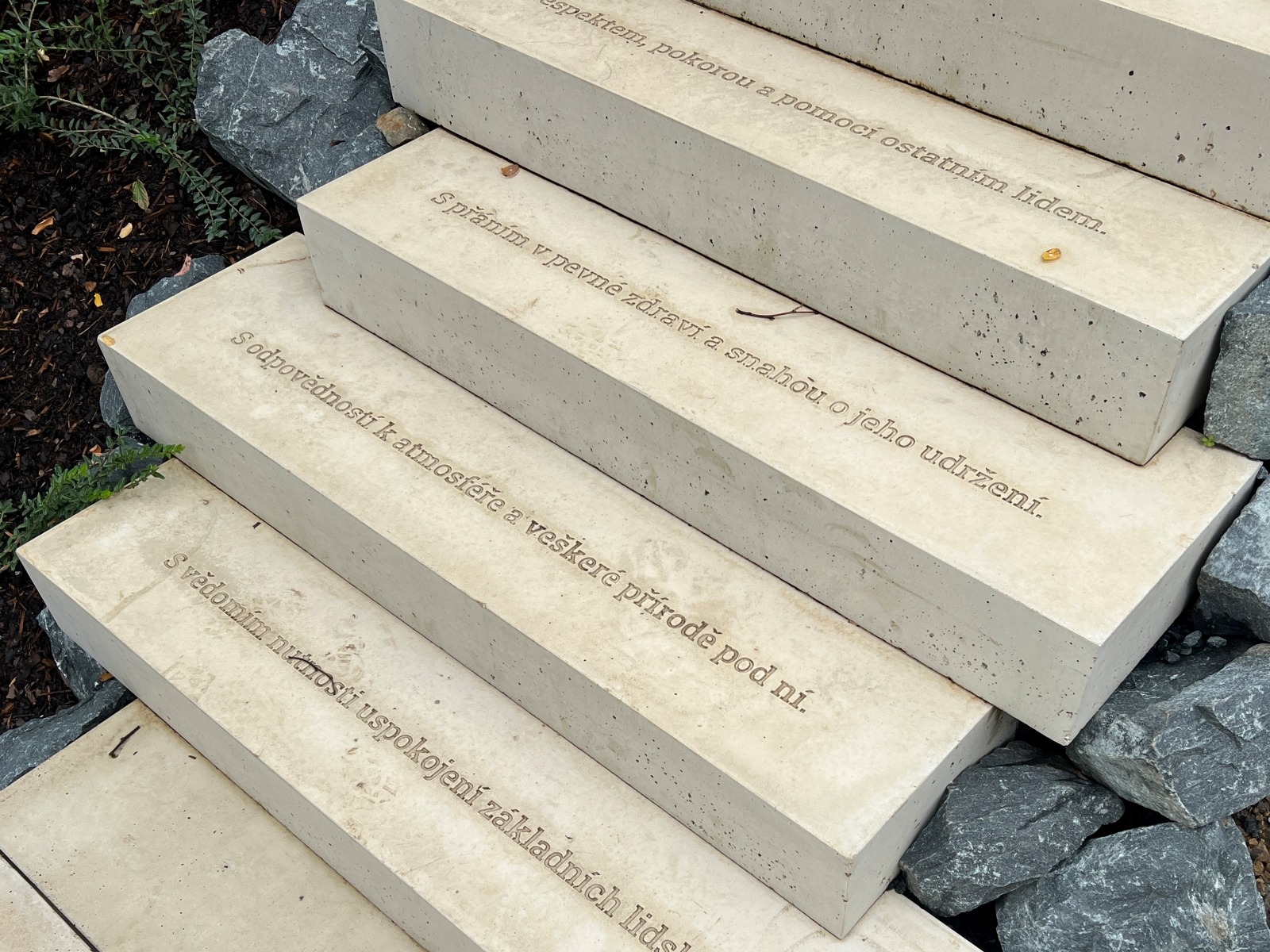 Velkoformátové dlaždice z bílého betonu pro vjezdy a vchody. Velké dlaždice pro jezdecké schody. Graficky beton a největší dlaždice, kterou jsme vyráběli. To vše je v tomto projektu. Krásná soukromá zahrada v Praze. Nás tento projekt naučil logistice, manipulaci a instalaci jeřábní technikou na místě.